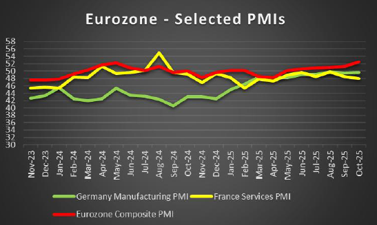 In the coming week we note that there are financial releases of interest for EUR traders and in particular the PMI figures for Germany, France and the Eurozone. However, lets recap this week’s financial releases and in particular the preliminary GDP rates for Q3 for the Zone which were released earlier on today. Specifically, we would like to note that on a year-on-year level came in better than expected at 1.4% versus 1.3% which could provide some support for the EUR. Yet when looking at the prior rate of 1.5%, the economic picture did not improve. Regardless, in combination with the ZEW Economic sentiment for November which also came in better than expected at 25.0%, which may have provided support for the EUR since the start of the week. Although we should note that France’s HICP rate for October came in lower than expected, implying easing inflationary pressures in the French economy, which may have weighed on the common currency. On a monetary policy level we note that succession talks may be beginning, as four of the six jobs on the ECB’s executive board will be vacant by the end of 2027, starting with ECB Vice President de Guindo’s whose term ends in May. In turn as talks begin as to who may replace the Vice President of the ECB, the EUR may experience some volatility depending on the nature of the announcements.