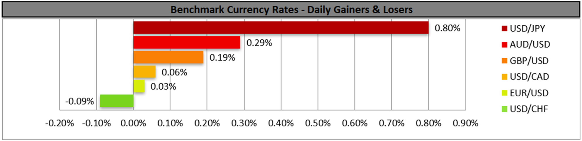 USD/JPY rose on Friday breaking the 156.00 (S1) resistance line, now turned to support. The pair’s price action seems to have stabilised, as it hit the upper Bollinger band, while the RSI indicator escaped the boundaries of the reading of 50 and rose signaling a strengthening bullish market sentiment for the pair. We adopt a bullish outlook for the pair, yet warn for the stabilisation of the pair to be extended. Should the bulls maintain control, we may see the pair breaking the 158.80 (R1) resistance line and thus pave the way for the 161.90 (R2) resistance hurdle. Should the bears take over, we may see the pair reversing direction, breaking the 156.00 (S1) support line and start aiming if not breaching the 152.90 (S2) support barrier.