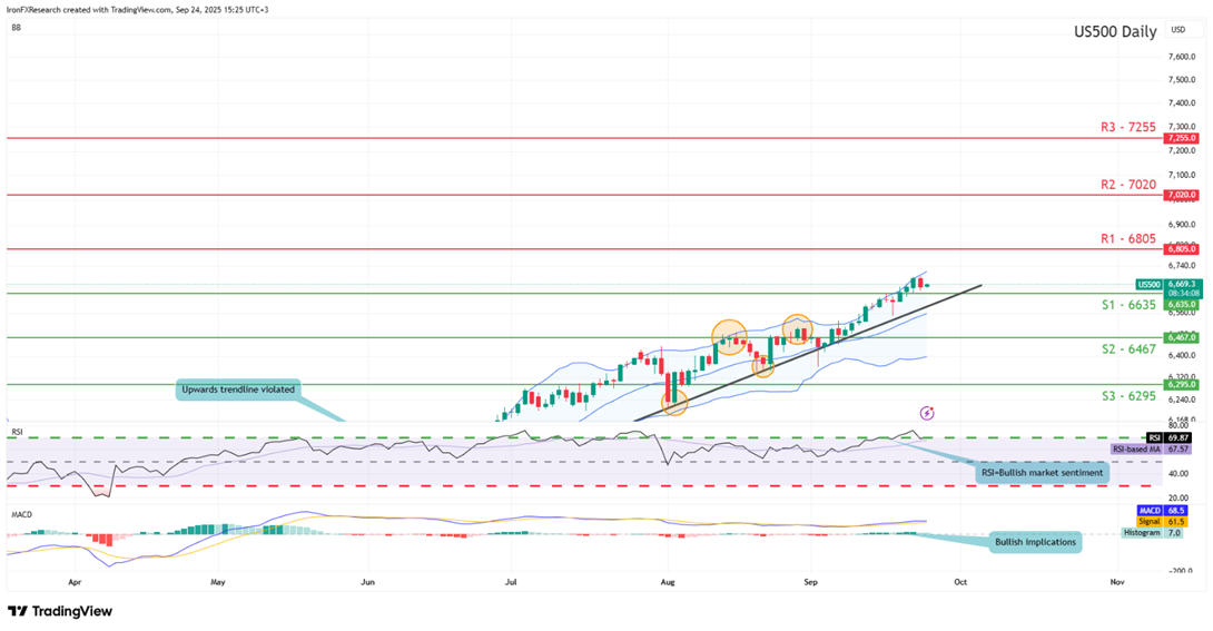 The US PCE rates for August are set to be released on Friday and are expected to showcase an acceleration of inflationary pressures at least on a headline level. In particular the headline PCE rate for August is expected to come in at 2.7% which would be higher than the prior rate of 2.6% and could validate Fed Chair Powell’s concerns about cutting rates too early. Specifically, the Fed Chair noted that it is a “challenging situations” and with “Two-sided risks mean that there is no risk-free path” showcasing the concern about inflation resurfacing should the Fed continue cutting rates too early, which could lead to a policy reversal down the line. Regardless, traders’ attention may have now turned to the PCE rates which are the Fed’s favourite tool for measuring inflationary pressures in the US economy and hence should the aforementioned scenario occur, it could weigh on the US Equities markets as the relatively tight financial conditions surrounding the US economy may remain in place for a greater period of time. However, should the PCE rates showcase easing inflationary pressures, it may increase pressure on the Fed to cut rates in the near future it order to aid the ailing labour market which has recently raised some concern amongst policymakers. Such a scenario may have the opposite effect and could in turn aid US stockmarkets. In our view, for a significant shift in Fed Chair Powell’s tone to emerge a clear indication of easing or an acceleration of inflationary pressures may need to be seen rather than small incremental increases or reductions.