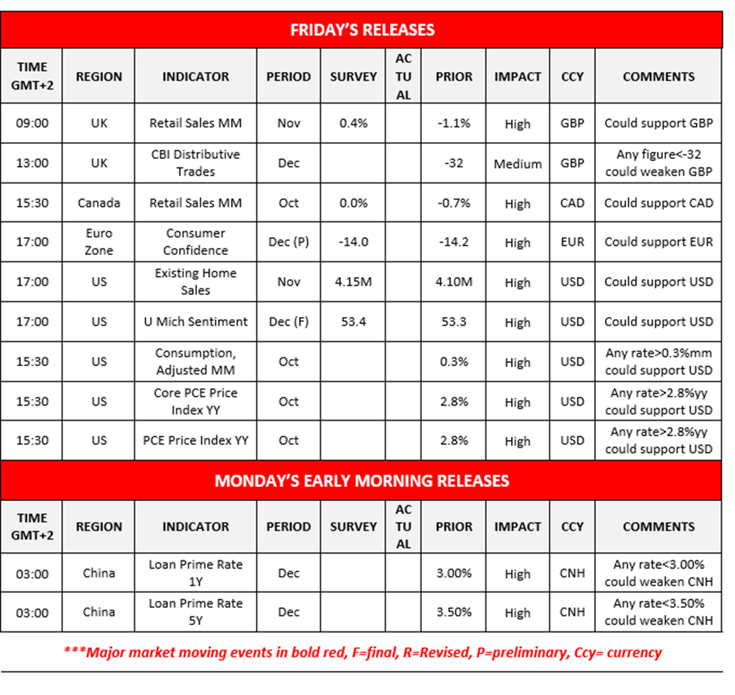 Today, we get the UK’s retail sales rate for November, UK distributive trades figure for December, Canada’s retail sales rate for October,the Eurozone’s preliminary consumer confidence figure for December, the US existing home sales rate for November. The US University of Michigan final consumer sentiment figure for December, the US consumption rate for October, the US PCE rates for October. In tomorrow’s Asian session we note the PBOC’s interest rate decision .