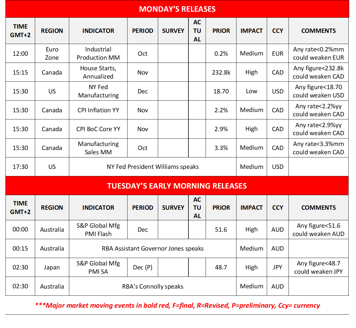 On Tuesday we get France’s , Germany’s, the Euro Zone’s, the UK’s and the US preliminary PMI figures for December as well as UK’s employment data for October, Germany’s ZEW indicators for December and from the US we highlight the release of the US employment report for November, with its NFP figure and also note the release of the retail sales for October. On Wednesday, we get Japan’s trade data for November, UK’s CPI rates for November, Germany’s Ifo indicators for December and New Zealand’s GDP rate for Q3. On Thursday we get the interest rate decisions of Sweden’s Riksbank, Norway’s Norgesbank, UK’s Bank of England, the Euro Zone’s ECB and the Czech Republic’s CNB. Also on Thursday we note from the USD, the release of the CPI rates for November, the weekly initial jobless claims figure and the Philly Fed Business index for December. On Friday we get Japan’s CPI rates for November, BoJ’s interest rate decision, Germany’s Gfk consumer confidence for January, UK’s November retail sales, the US CPI rates for October, Canada’s retail sales for October and the Euro Zone’s preliminary consumer confidence for December.