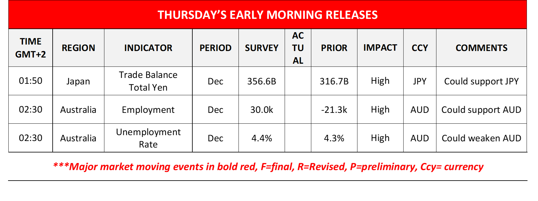 Aussie traders are expected to focus on the release of December’s employment data and a possibly tighter Australian employment market could provide some support for AUD and vice versa.